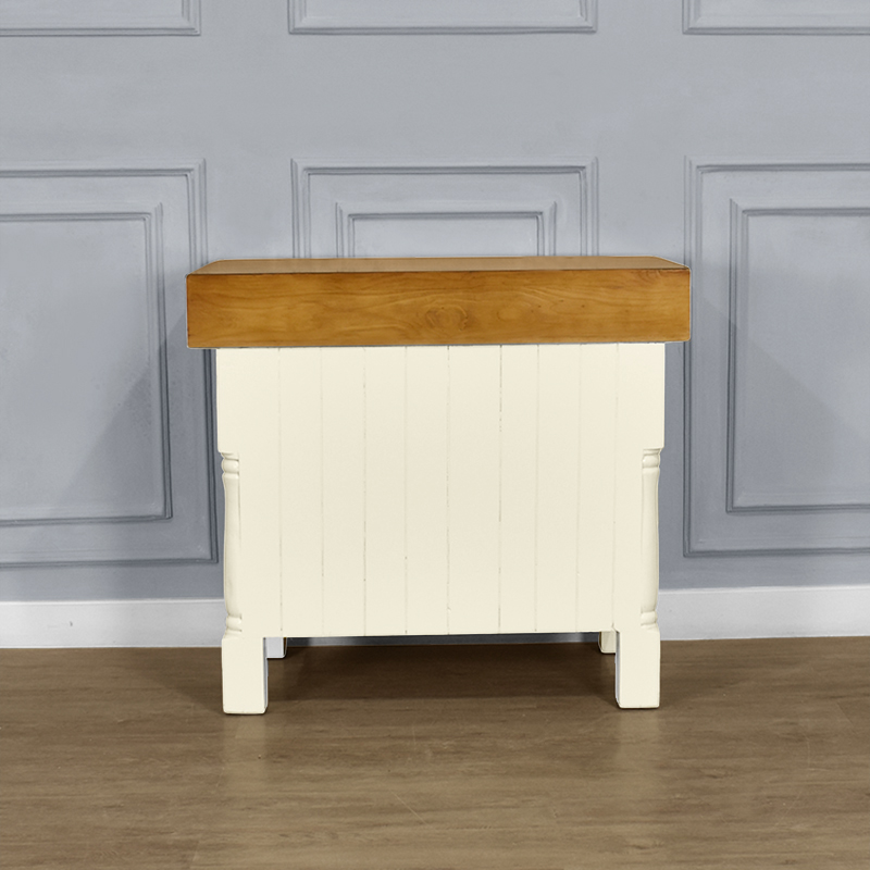 • This butchers block combines solid hardwood top in French oak colour and French Ivory painted frame for a contemporary take on the classic country farmhouse look.